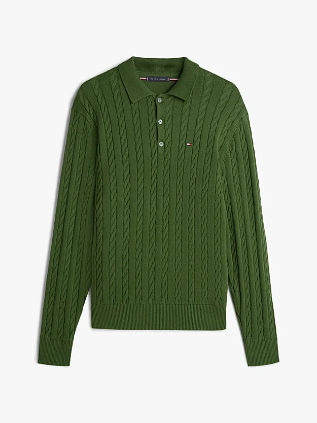 Elevate your cold-weather essentials with the Cable Knit Polo Jumper, a modern twist on a timeless classic. Crafted from soft, breathable cotton, this jumper combines a traditional cable-knit texture with a refined polo collar and button placket for a smart-casual aesthetic. The Mountain Pine green hue adds depth and versatility, making it a sophisticated layering piece for both office and weekend wear.